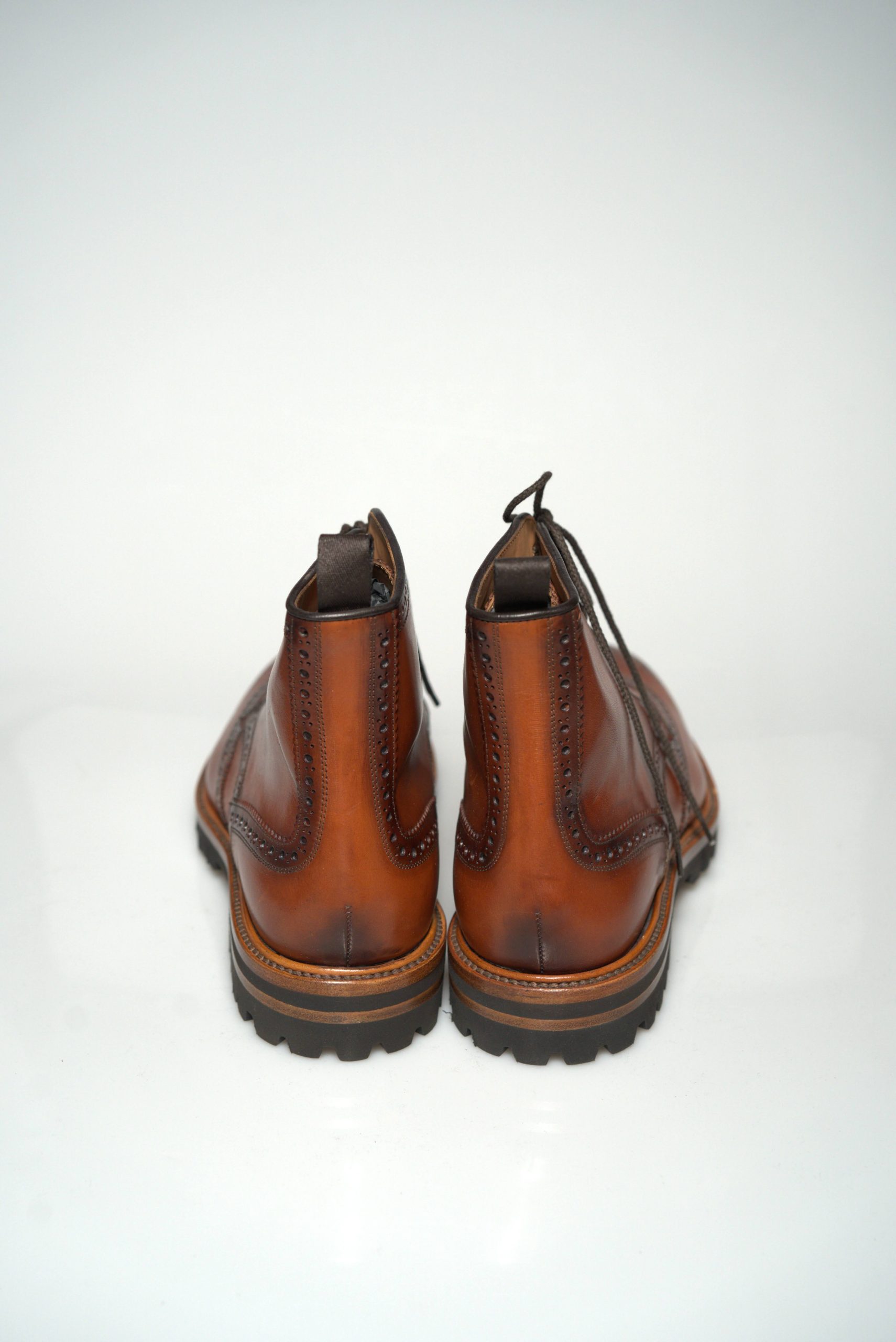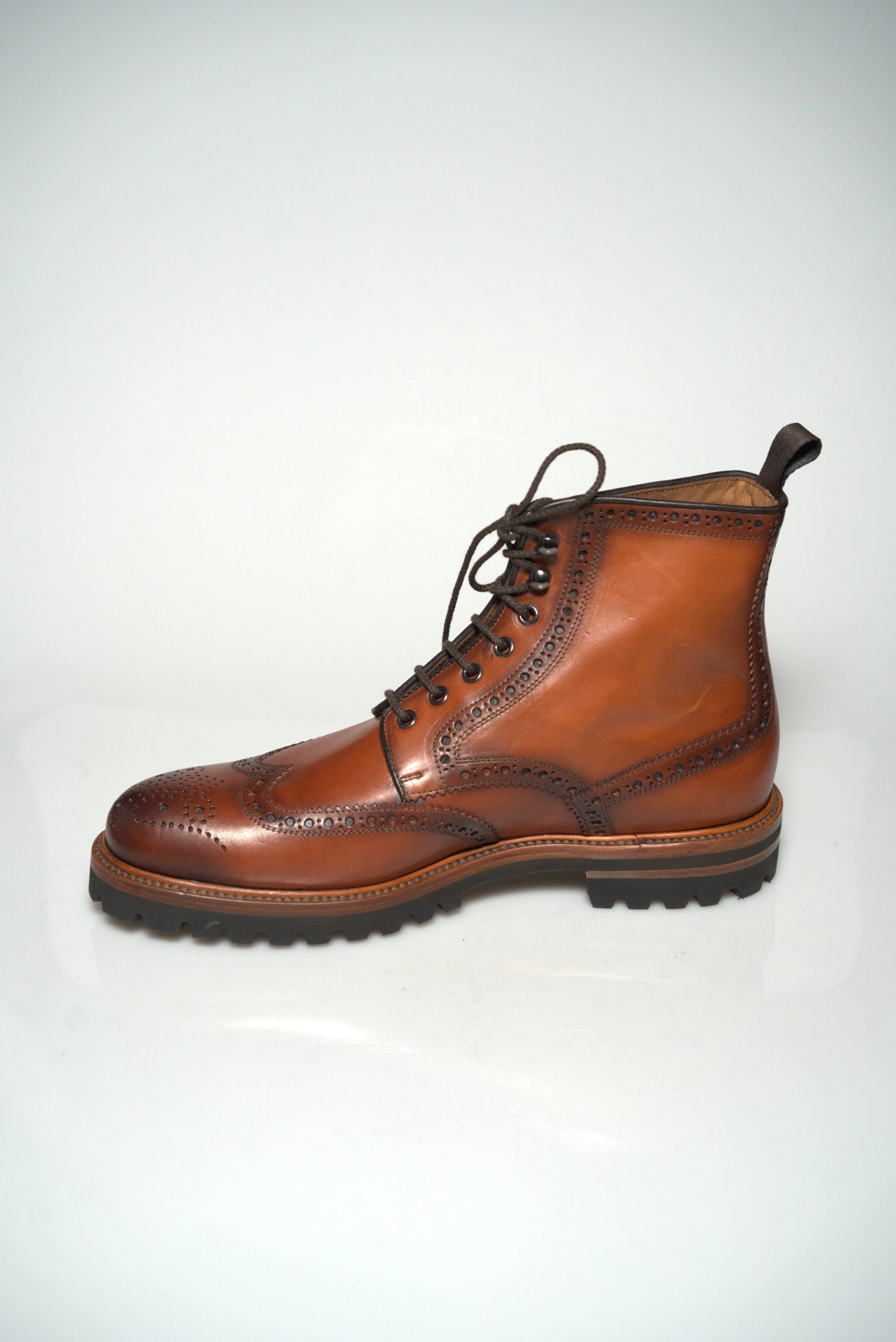 Ovaj model je definicija “robusne elegancije”. Izrađene od vrhunske “Manitoba” kože u bogatoj “Sienna” (crvenkasto-smeđoj) nijansi, ove čizme odmah privlače pažnju svojim sofisticiranim wingtip (brogue) perforacijama i ručno obrađenom završnicom koja im daje dubinu i karakter.